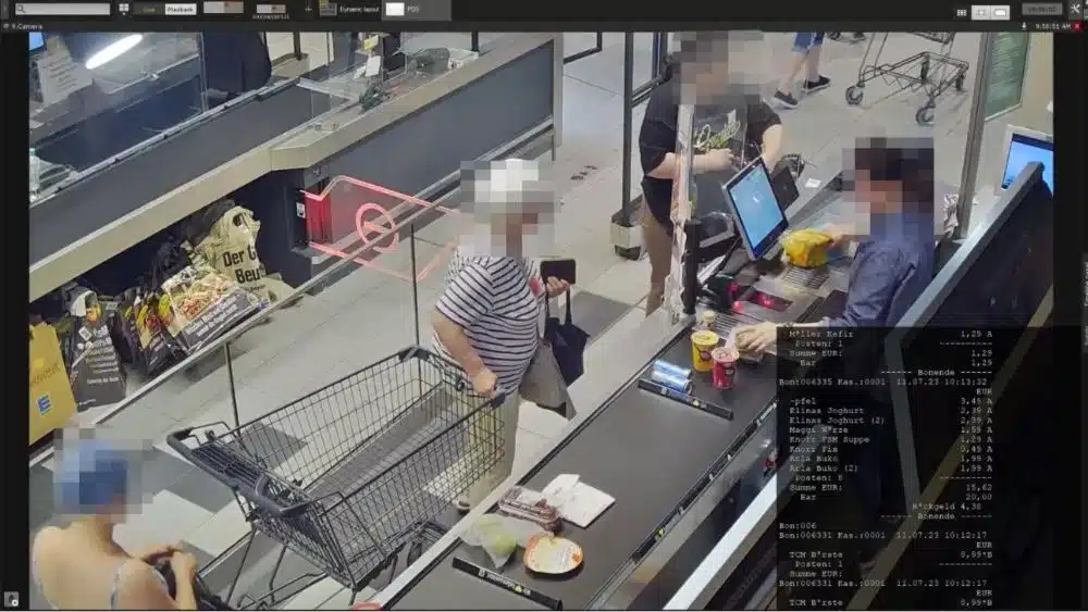 The receipt text and cash register events are overlaid on the video as titles and stored in a database.